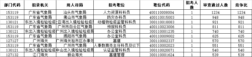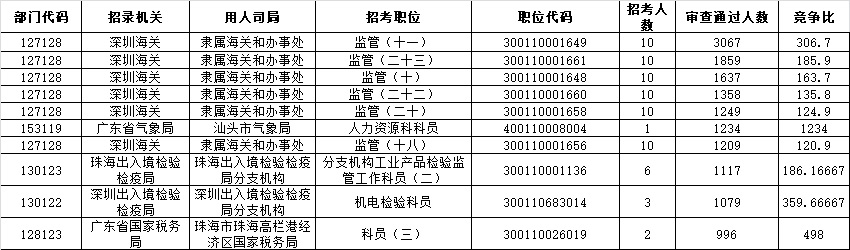 報名通過審核人數(shù)前十的職位主要集中在深圳海關(guān)、廣東省氣象局、珠海出入境檢驗檢疫局等部門,具體信息如下:
