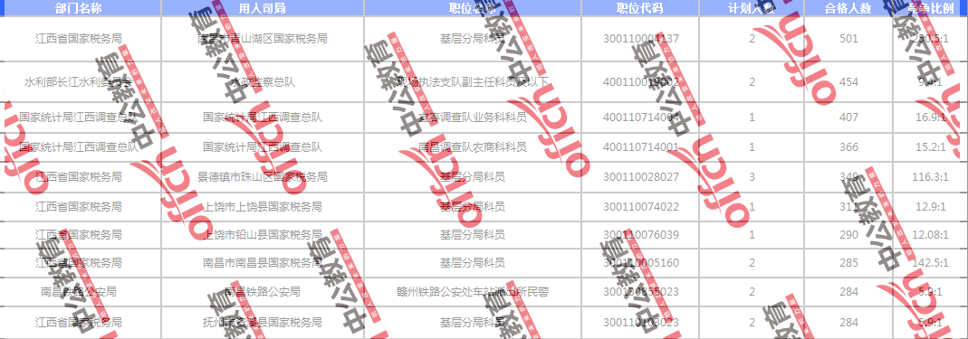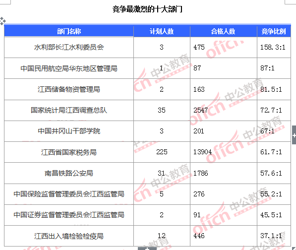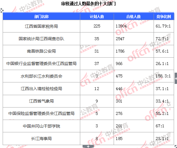 報(bào)名通過審核人數(shù)前十的職位主要集中在國家統(tǒng)計(jì)局江西調(diào)查總隊(duì) 水利部長江水利委員會(huì) 國家統(tǒng)計(jì)局江西調(diào)查總隊(duì)等部門,具體信息如下: