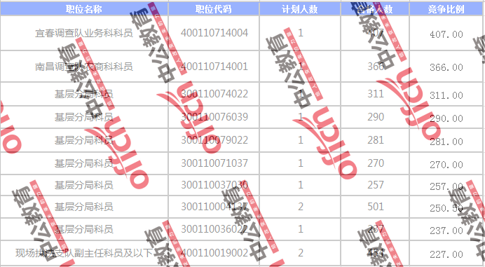 截止到8日17:30時(shí),競爭比例的職位為國家統(tǒng)計(jì)局江西調(diào)查總隊(duì)國家統(tǒng)計(jì)局江西調(diào)查總隊(duì)宜春調(diào)查隊(duì)業(yè)務(wù)科科員一職,招錄1人,截止到8日17:30時(shí)通過人數(shù)為407人,競爭比為407:1