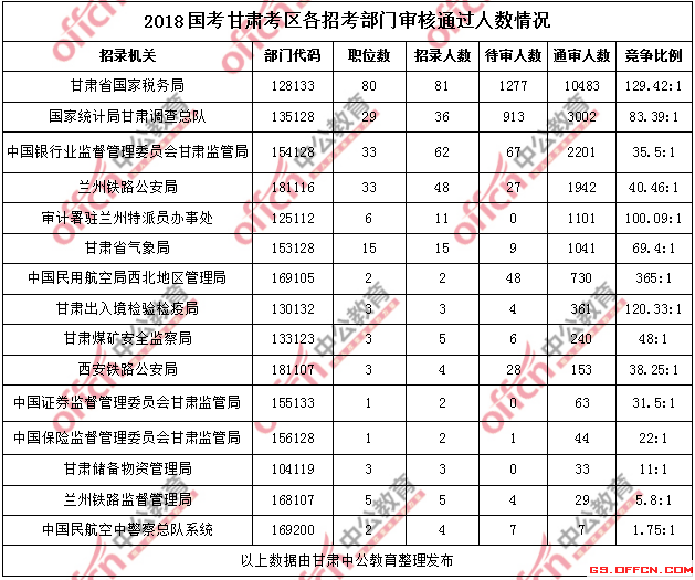 11月8日17:30,通過審核人數(shù)前三位的部門依次是:甘肅省國家稅務(wù)局、國家統(tǒng)計(jì)局甘肅調(diào)查總隊(duì)、中國銀行業(yè)監(jiān)督管理委員會甘肅監(jiān)管局。三部門通過審核總?cè)藬?shù)達(dá)15686人,占通過審核總?cè)藬?shù)的73.20%。