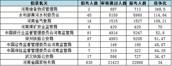 為幫助廣大考生更清晰的了解今日報名情況,中公網(wǎng)校整理了審核通過人數(shù)前十位的部門以及競爭比例最激烈的十個部門,供廣大考生參考:
