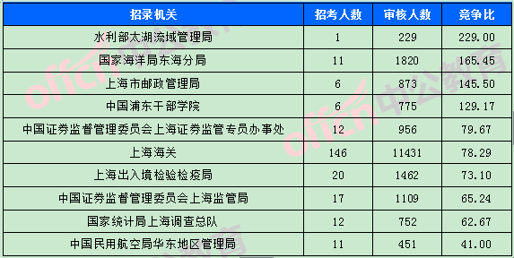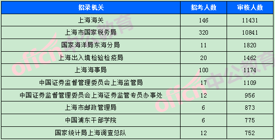 為幫助廣大考生更清晰的了解今日?qǐng)?bào)名情況,上海中公網(wǎng)校整理了審核通過(guò)人數(shù)前十位的部門以及競(jìng)爭(zhēng)比例最激烈的十大部門,供廣大考生參考: