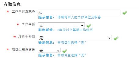 “項(xiàng)目生類別”有5個(gè)選項(xiàng),分別為“無”、“選聘高校畢業(yè)生到村任職”、“三支一扶計(jì)劃”、“大學(xué)生志愿服務(wù)西部計(jì)劃”、“農(nóng)村義務(wù)教育階段教師特設(shè)崗位計(jì)劃”;