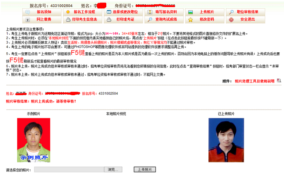 4、點擊‘上傳照片’按鈕,顯示‘已上傳照片,未審核,請等待審核!’如圖4-6,查看照片是否通過,可在圖4-6的頁面進行查看。需要注意:每次上傳或更換照片后必按F5鍵刷新,否則有可能在“本地照片預(yù)覽”框內(nèi)看到的是上一次的照片,導(dǎo)致上傳后的并非本人??忌牲c擊“不合格照片示例”按鈕查看不符合要求的照片(僅做示例)。
