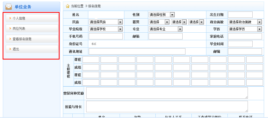 三:輸入報名信息。在報名信息列表里面有四行,個人信息-崗位列表-查看報名信息-退出。需要一步一步按照順序進行填寫,所以請廣大考生慎重填寫。