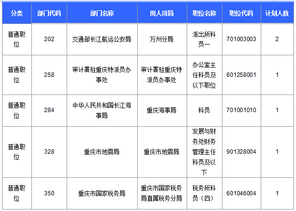 截至16日8時(shí),重慶地區(qū)共有124個(gè)職位無人報(bào)考,占全部職位的46.9%。下面是部分無人報(bào)考職位一覽表,中公網(wǎng)校專家建議廣大考生多關(guān)注一些競爭激烈性小的職位,避免激烈競爭,結(jié)合自身?xiàng)l件,找到屬于自己的職位。