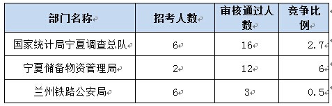 截至16日8時,競爭比例的職位為寧夏儲備物資管理局物資管理處主任科員及以下(職位代碼:601491001),招錄1人,審核合格通過10人。