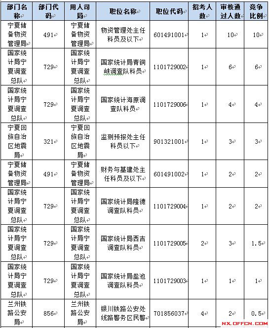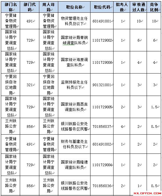 報名通過審核人數(shù)前十的職位主要集中在寧夏儲備物資管理局、國家統(tǒng)計局寧夏調(diào)查隊、蘭州鐵路公安局、寧夏回族自治區(qū)地震局等部門,具體信息如下: