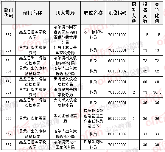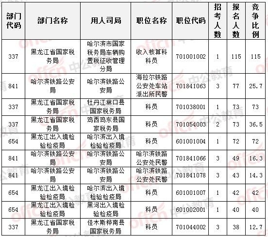 截至17日18時,招錄比例的職位為黑龍江省國家稅務局哈爾濱市國家稅務局車輛購置稅征收管理分局收入核算科科員一職,招錄1人,通過人數(shù)為115人,競爭比例達到115:1,具體信息如下: