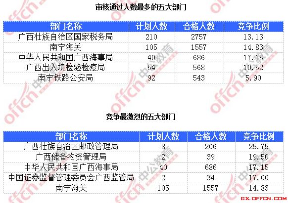 為幫助廣大考生更清晰的了解今日報名情況,中公網校整理了審核通過人數(shù)前五位的部門以及競爭比例最激烈的五大部門,供廣大考生參考: