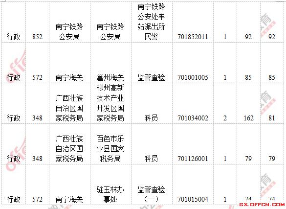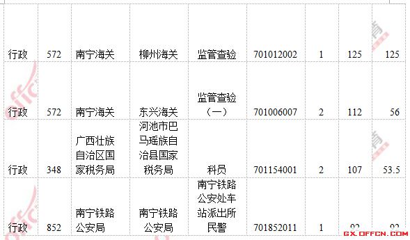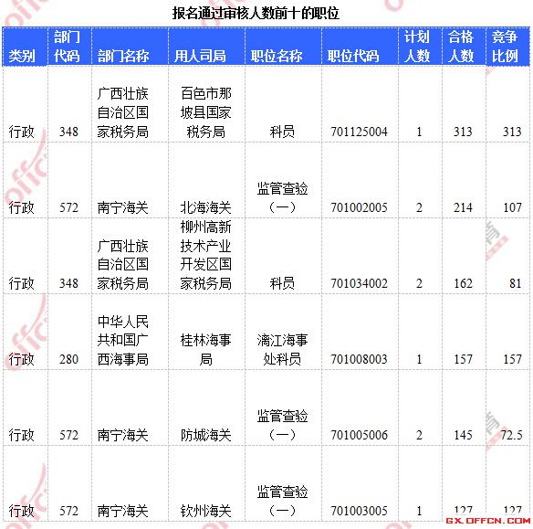 報名通過審核人數(shù)前五的職位主要集中在廣西壯族自治區(qū)國家稅局、海事局和南寧海關,具體信息如下: