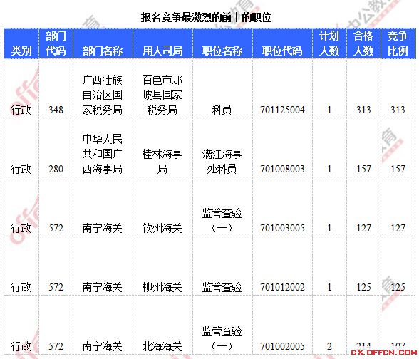 截至20日8時,招錄比例的職位依然是百色市那坡縣國家稅務局科員一職,招錄1人,審核通過人數(shù)為313人,競爭比例313:1,競爭比例超100的職位有五個。