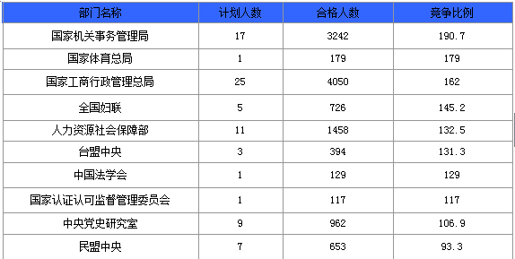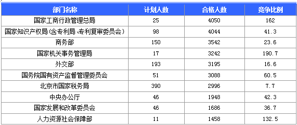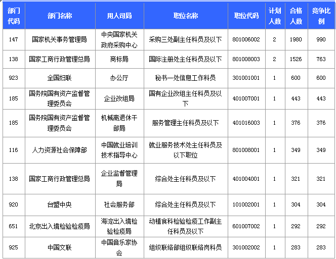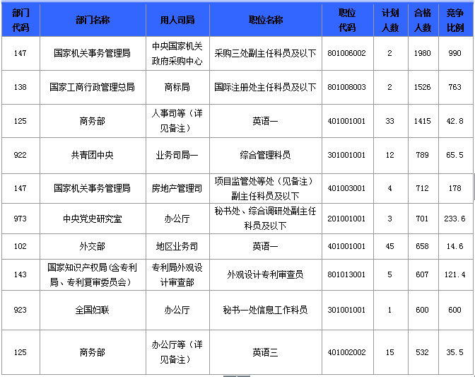 報(bào)名通過審核人數(shù)前十的職位主要集中在國家機(jī)關(guān)事務(wù)管理局、國家工商行政管理總局、商務(wù)部、共青團(tuán)中央等部門,具體信息如下:
