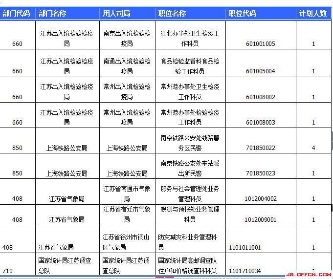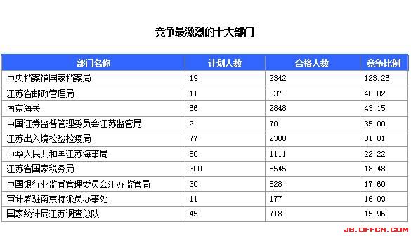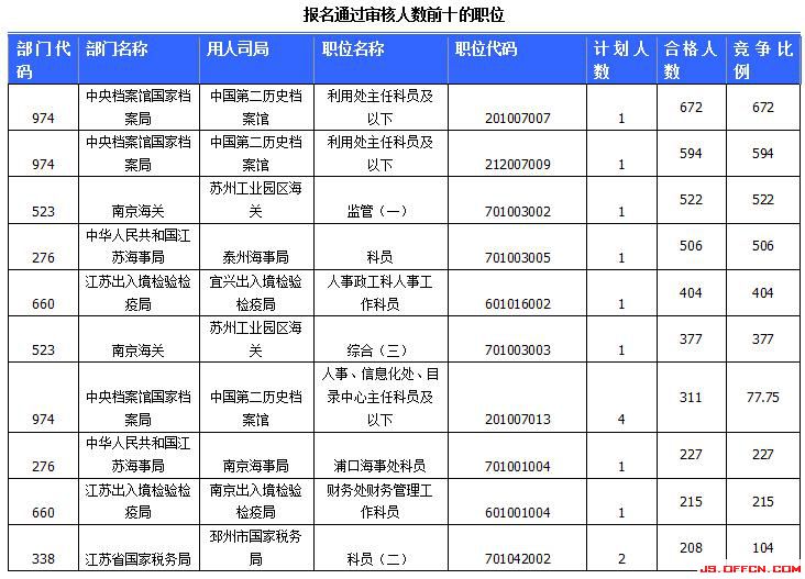 報(bào)名通過審核人數(shù)前十的職位主要集中在中央檔案館國(guó)家檔案局、中華人民共和國(guó)江蘇海事局、南京海關(guān)、江蘇出入境檢驗(yàn)檢疫局等部門,具體信息如下: