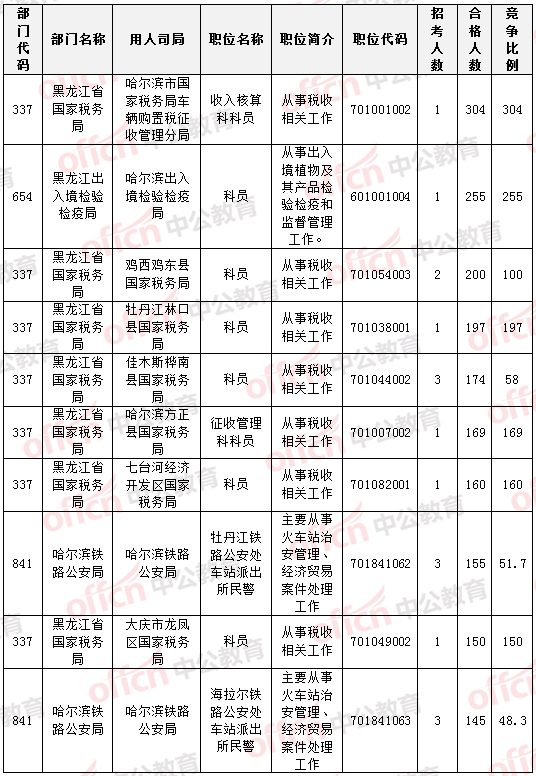 截至21日8時(shí),招錄比例的職位為黑龍江省國(guó)家稅務(wù)局哈爾濱市國(guó)家稅務(wù)局車(chē)輛購(gòu)置稅征收管理分局收入核算科科員一職,招錄1人,審核通過(guò)人數(shù)已經(jīng)達(dá)到304人,連續(xù)多日霸占首位,具體信息如下: