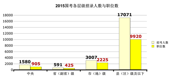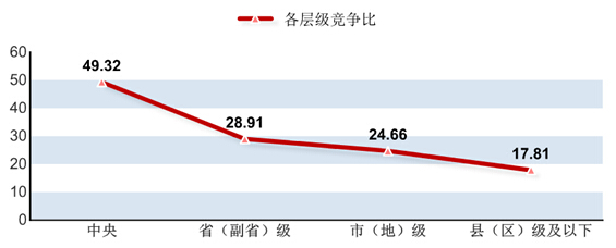 中央、省、市、縣四級目前競爭比是逐漸下降的,中央競爭比,為49.32:1,接近50人爭一個職位,縣(區(qū))級及以下最低,僅為17.81:1。中公教育專家分析,考生都偏愛中央層級的職位,都想進入“高層”。 9月25日,人社部聯(lián)合多個部委正式公布了《關(guān)于做好艱苦邊遠地區(qū)基層公務(wù)員考試錄用工作的意見》,從六個方面明確了降低了邊遠地區(qū)公務(wù)員的進入門檻,且基層公務(wù)員工資改革在即,基層職位的發(fā)展前景廣闊。而在2015國考公告中也明確指出:對西部地區(qū)和艱苦邊遠地區(qū)職位、基層職位和特殊專業(yè)職位等,在劃定最低合格分數(shù)線時將予以政策傾斜。中公教育專家建議考生可將眼光放長遠,多關(guān)注西部邊遠地區(qū)職位,積極響應國家的優(yōu)待政策,下基層去鍛煉自己,為將來的宏圖偉業(yè)奠定基石!