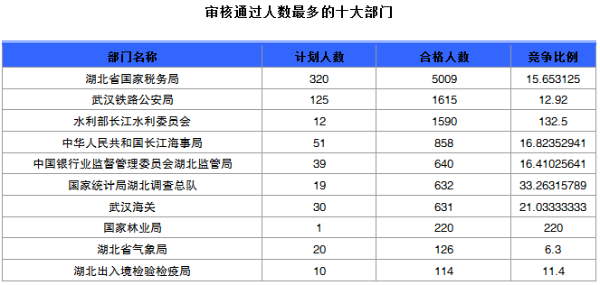 截至21日8時(shí),通過審核人數(shù)前三位的部門依次是:湖北省國家稅務(wù)局、武漢鐵路公安局、水利部長江水利委員會,三部門通過審核總?cè)藬?shù)達(dá)8214人,占通過審核總?cè)藬?shù)的69.7%。