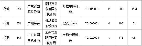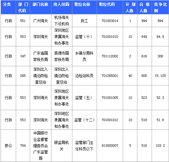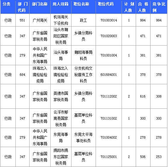 截至21日8時(shí),招錄比例的職位為廣州海關(guān)政工一職,招錄1人,通過人數(shù)為994人,報(bào)名通過審核人數(shù)前十的職位主要集中在廣州海關(guān)、深圳海關(guān)、廣東省國家稅務(wù)局等部門,具體信息如下: