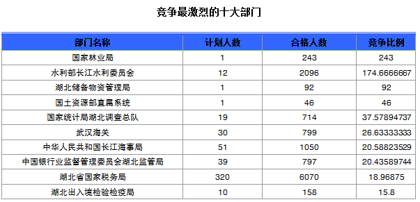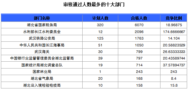 報(bào)名通過審核人數(shù)前十的職位主要集中在水利部長江水利委員會、中華人民共和國長江海事局、湖北省國家稅務(wù)局等部門,具體信息如下: