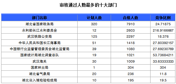 截至22日16時(shí),通過審核人數(shù)前三位的部門依次是:湖北省國家稅務(wù)局、水利部長江水利委員會(huì)、武漢鐵路公安局,三部門通過審核總?cè)藬?shù)達(dá)12810人,占通過審核總?cè)藬?shù)的68.6%。