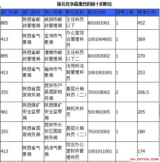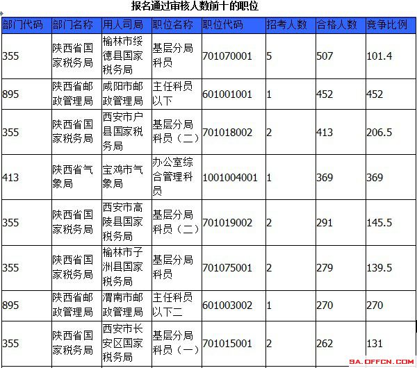 報(bào)名通過審核人數(shù)前十的職位主要集中在陜西省郵政管理局、陜西省氣象局、陜西省國(guó)家稅務(wù)局等部門,具體信息如下: