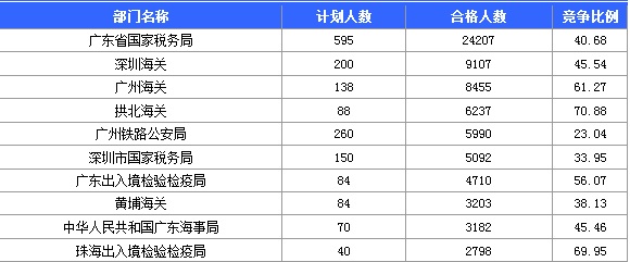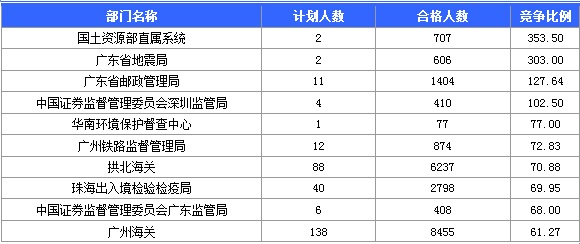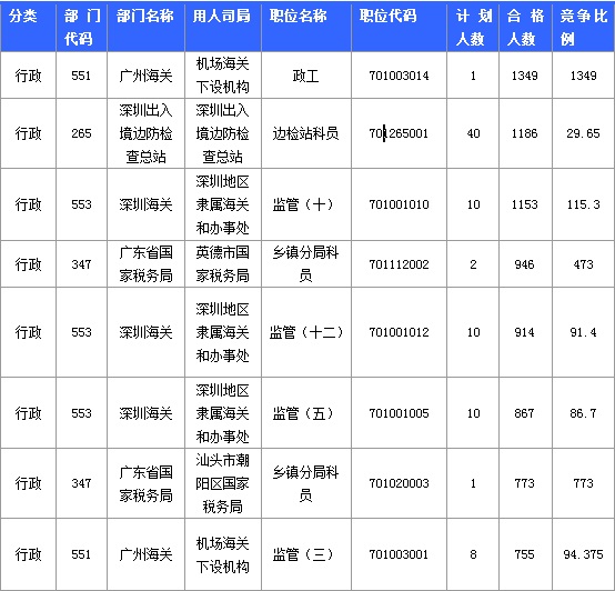 截至23日8時(shí),招錄比例的職位為廣州海關(guān)政工一職,招錄1人,通過人數(shù)為1349人,報(bào)名通過審核人數(shù)前十的職位主要集中在廣州海關(guān)、深圳出入境邊防檢查總站、深圳海關(guān),具體信息如下: