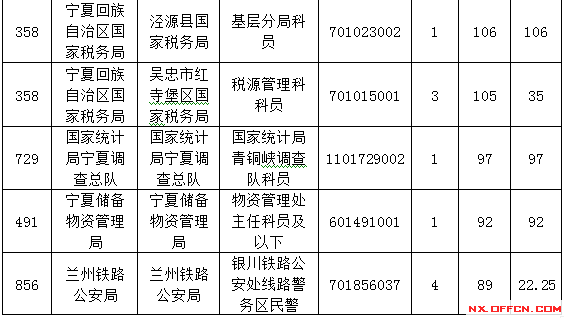 截至23日8時,工作地在寧夏地區(qū)的共有2個職位無人報考,占全部職位的 2.6%。下面是無人報考職位一覽表,中公網(wǎng)校專家建議廣大考生多關注一些競爭激烈性小的職位,避免激烈競爭,結合自身條件,找到屬于自己的職位。