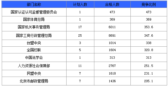 報(bào)名通過審核人數(shù)前十的職位主要集中在國家機(jī)關(guān)事務(wù)管理局、國家工商行政管理總局、商務(wù)部、共青團(tuán)中央等部門,具體信息如下:
