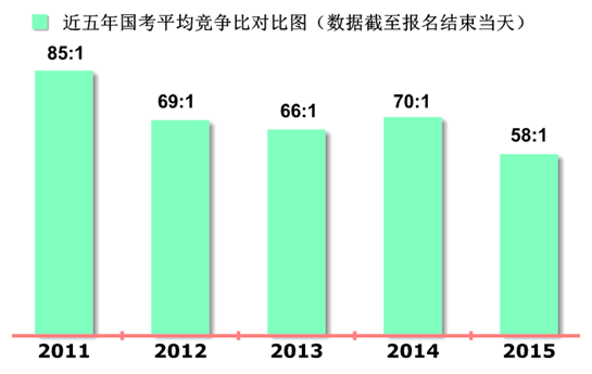 2015年度“國考”報名工作于10月24日晚如期結(jié)束。截止24日17:30,審核通過總?cè)藬?shù)129萬人,競爭比為58:1。去年同期數(shù)據(jù)為136萬人,競爭比為70:1。目前各招錄機(jī)關(guān)審核仍在進(jìn)行中,周末將統(tǒng)計出最終的報名數(shù)字。中公網(wǎng)校專家緊跟國考報名全過程,發(fā)現(xiàn)今年報考呈現(xiàn)三大特點(diǎn):