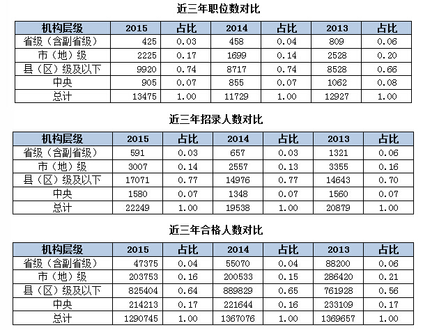 從機構(gòu)層級來看,三年來縣(區(qū))級及以下的職位數(shù)、招錄人數(shù)、合格人數(shù)在各層級中均占比。而今年縣(區(qū))級及以下的職位數(shù)和招錄人數(shù)比前兩年都高,而合格人數(shù)較去年卻下降6萬多人,從一定程度上反映了考生依然不太喜歡選擇基層職位,加之今年很多基層職位為了留住人才,要求考生最低服務年限為5年,這也卡掉了一大批想報基層的考生,縣級以下職位報考不如往年“”。中公教育提醒考生,不“熱”對考生來講是個好消息,可以減少“炮灰”幾率。