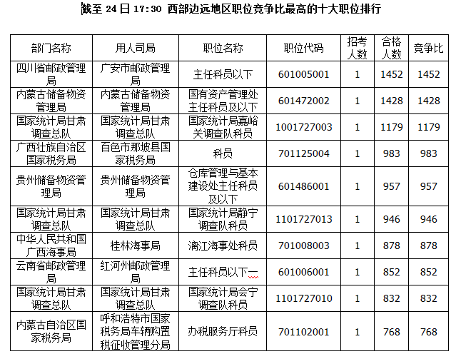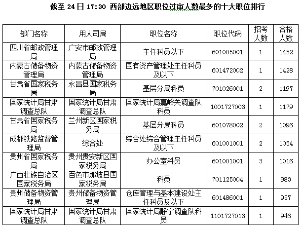 從西部邊遠職位來看,截至24日17:30共審核通過347523人,平均競爭比41.7:1,低于2015國考平均競爭比,有72個職位無人通過審核。四川郵政管理局廣安市郵政管理局主任科員以下職位過審人數(shù)最多,已有1452人過審。