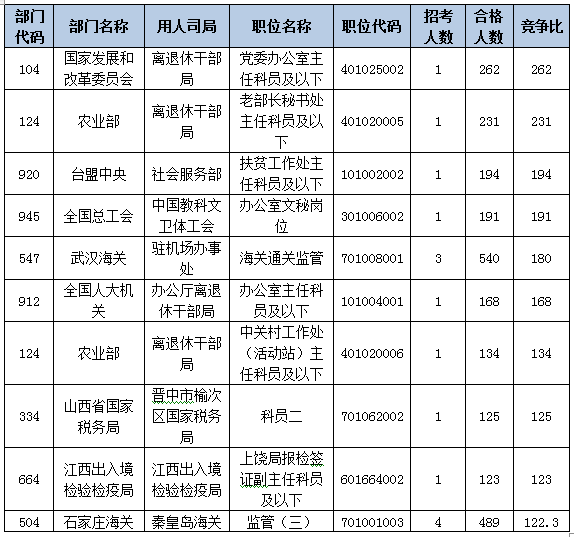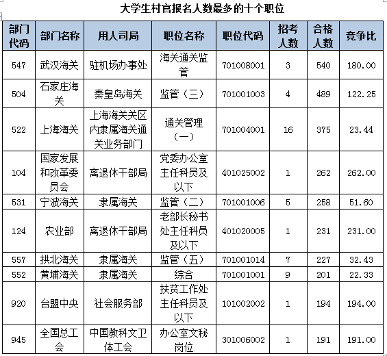 截至24日17:30,大學生村官報名人數(shù)最多的十個職位中有6個是縣(區(qū))級及以下機構層級,“武漢海關”的“海關監(jiān)管”一職位居榜首,競爭比排第五。而競爭最激烈的是“國家發(fā)展和改革委員會”的“黨委辦公室主任科員及以下”一職,競爭比高達262:1。