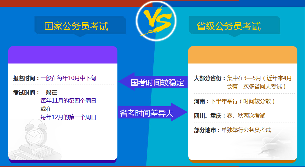 省考和國考在考試時間、考試內(nèi)容、考試地點和考試難度方面都存在或多或少的差異。就考試時間而言,國考時間基本是固定的,報名時間在每年10月中旬,考試時間在11月下旬,面試時間在來年2-3月份。而各省省考時間則不相同,近年來參加聯(lián)考的省份越來越多,2016年參加聯(lián)考的地區(qū)已經(jīng)增至25個,為歷年之最。