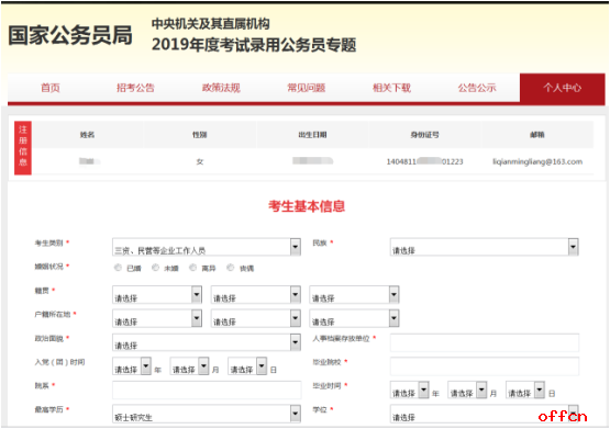 中公教育專家提醒考生,點(diǎn)擊“完善個(gè)人信息”之后就要進(jìn)入全面填寫信息頁面,考生們此時(shí)可將相關(guān)的證件準(zhǔn)備出來,以便填寫時(shí)準(zhǔn)確輸入,頁面詳情如下: