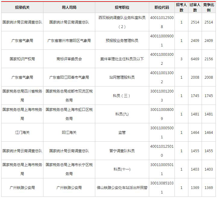 2019國(guó)考報(bào)名過(guò)審人數(shù)競(jìng)爭(zhēng)最激烈前十職位