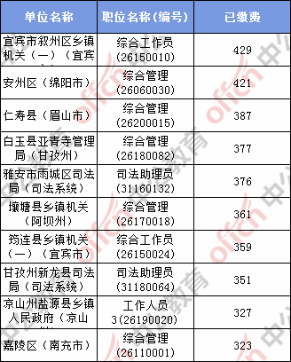 截止到26日上午10點,報名繳費人數(shù)最多的職位為:宜賓市敘州區(qū)鄉(xiāng)鎮(zhèn)機關(一)(宜賓市) 綜合工作員(26150010)、安州區(qū)(綿陽市) 綜合管理(26060030)、仁壽縣(眉山市) 綜合管理(26200015)、白玉縣亞青寺管理局(甘孜州) 綜合管理(26180082)、雅安市雨城區(qū)司法局(司法系統(tǒng)) 司法助理員(31160132)、壤塘縣鄉(xiāng)鎮(zhèn)機關(阿壩州) 綜合管理(26170018)、筠連縣鄉(xiāng)鎮(zhèn)機關(一)(宜賓市) 綜合工作員(26150024)、甘孜州新龍縣司法局(司法系統(tǒng)) 司法助理員(31180064)、涼山州鹽源縣鄉(xiāng)鎮(zhèn)人民政府(涼山州) 工作人員3(26190020)、嘉陵區(qū)(南充市) 綜合管理(26110001)