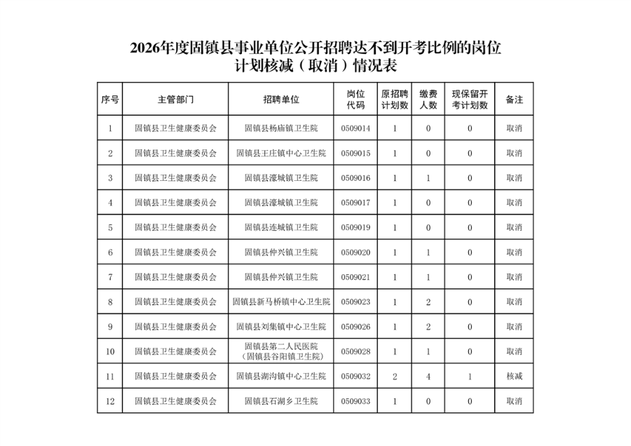 根據(jù)《2026年度固鎮(zhèn)縣事業(yè)單位公開(kāi)招聘工作人員公告》以及報(bào)名確認(rèn)和繳費(fèi)等情況,經(jīng)審定,現(xiàn)將我縣達(dá)不到規(guī)定開(kāi)考比例的崗位計(jì)劃核減(取消)情況予以公布,詳見(jiàn)附表。報(bào)名合格繳費(fèi)但崗位取消的報(bào)考人員,請(qǐng)于2026年2月12日12:00-17:00在安徽省人事考試網(wǎng)上改報(bào)考其他符合條件的崗位。