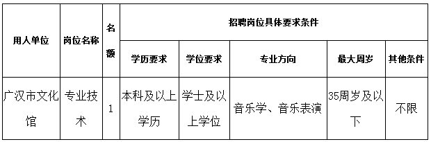 根據(jù)《關(guān)于事業(yè)單位招聘藝術(shù)專業(yè)技術(shù)人員的意見》(川人發(fā)〔2007〕43號)和《關(guān)于進一步規(guī)范事業(yè)單位工作人員和機關(guān)工勤人員招聘工作的通知》(德人社〔2013〕5號)等文件規(guī)定,經(jīng)研究決定,廣漢市文廣局下屬事業(yè)單位市文化館擬面向社會公開考核招聘1名工作人員,現(xiàn)將有關(guān)事項公告如下: