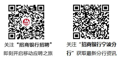 官方微信:掃描下方二維碼,關注“招商銀行招聘”微信公眾平臺,獲取的校園招聘信息,點擊“校園招聘”,申請感興趣的職位,投遞簡歷!