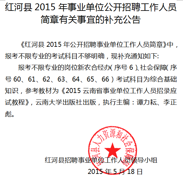 原標(biāo)題:紅河縣2015年事業(yè)單位公開招聘工作人員補(bǔ)充公告