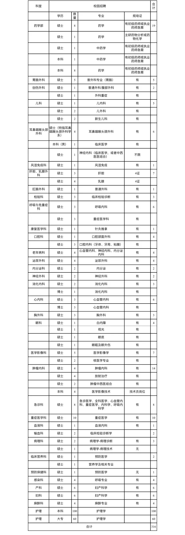 三、應(yīng)屆(2019、2020年)畢業(yè)生。醫(yī)療、醫(yī)技專業(yè)需取得碩士及以上學歷,取得執(zhí)業(yè)證書、規(guī)培證書;藥學、檢驗、技師專業(yè)需取得碩士及以上學歷,取得執(zhí)業(yè)證書;護理學專業(yè)需取得統(tǒng)招全日制??萍耙陨蠈W歷(不含3+2專科),要求高中起點(不含職業(yè)高中),取得護士執(zhí)業(yè)證書;