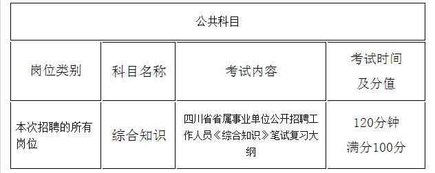 本次招聘考試所有崗位的筆試科目為公共科目?!端拇ㄊ∈偈聵I(yè)單位公開招聘工作人員《綜合知識》筆試復(fù)習(xí)大綱》見附件2,筆試均不指定復(fù)習(xí)資料,各崗位具體考試科目如下: