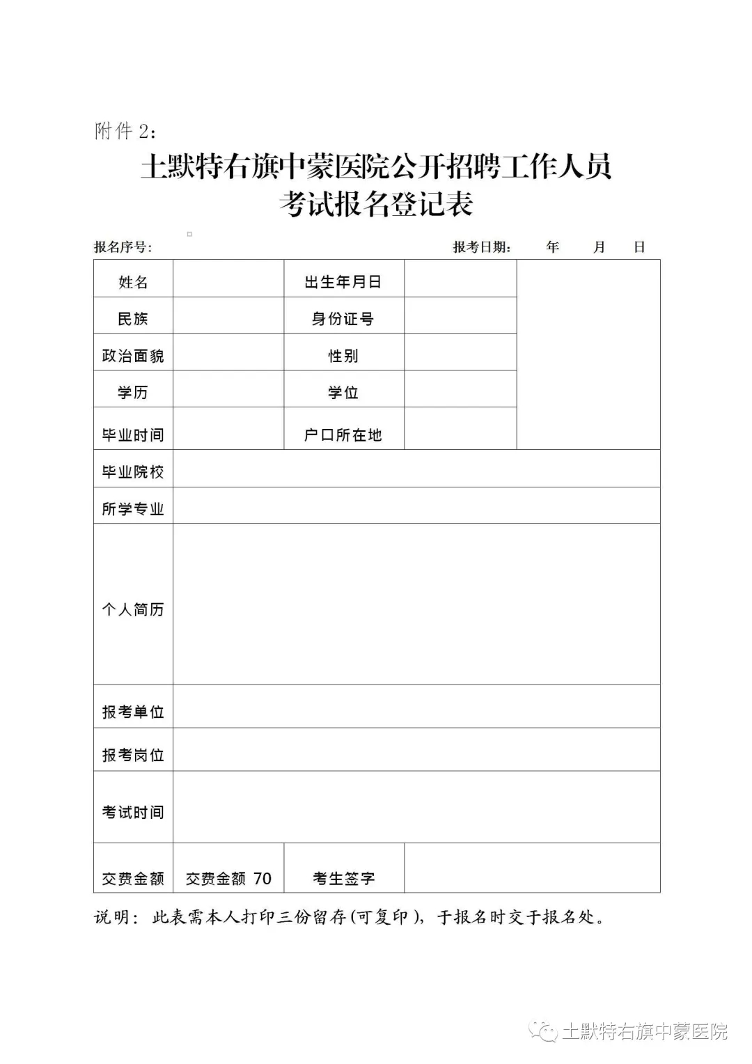 2、報名時,報名人員應(yīng)當(dāng)簽署《報名人員考試誠信承諾書》,否則不接受報名。報名時,報名人員要詳細(xì)、準(zhǔn)確、如實地填寫《土默特右旗中蒙醫(yī)院2020年公開招聘工作人員報名登記表》(以下簡稱《報名登記表》)