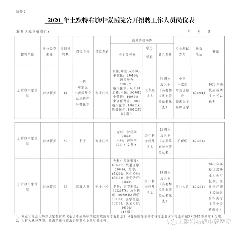 2、具體招聘崗位及要求見《土默特右旗中蒙醫(yī)院公開招聘工作人員崗位及要求一覽表》(附件一)。