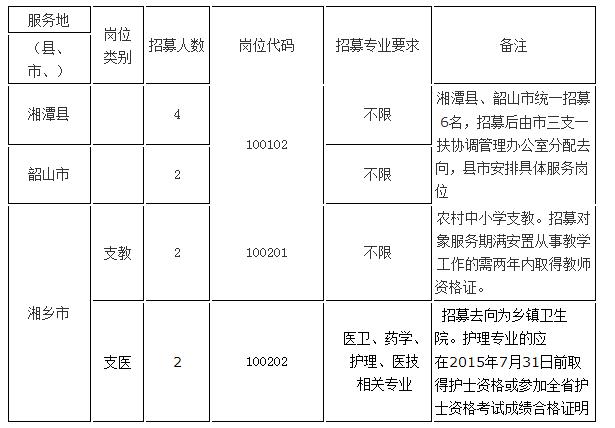 2015年全市“三支一扶” 招募計劃為10名,其中湘潭縣4名、湘鄉(xiāng)市4名、韶山市2名。