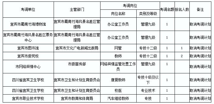2015年上半年宜賓市市屬事業(yè)單位公開考調(diào)工作人員報名繳費工作已結(jié)束,根據(jù)各崗位考生報名情況,部分未達(dá)考調(diào)公告規(guī)定的最低開考比例或無人報考的崗位,按考調(diào)公告規(guī)定予以調(diào)減或取消。現(xiàn)將調(diào)減取消的崗位公告如下: