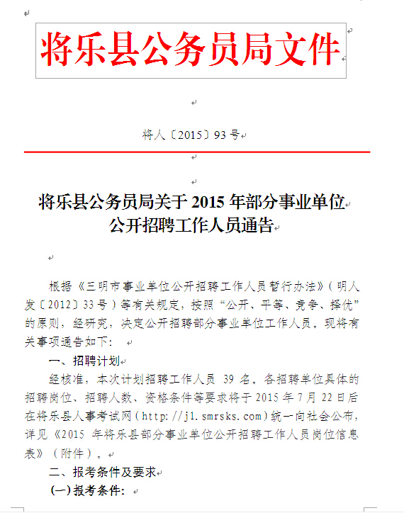 2015福建將樂縣事業(yè)單位招聘公告【招39人】