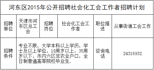 為適應(yīng)工會(huì)工作發(fā)展需要,根據(jù)市總工會(huì)《關(guān)于2015年選聘社會(huì)化工會(huì)工作者的通知》要求,河?xùn)|區(qū)總工會(huì)擬面向社會(huì)公開招聘社會(huì)化工會(huì)工作者,現(xiàn)將有關(guān)事項(xiàng)公告如下: