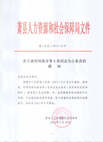 2015安徽蕭縣公務員考試錄用通知