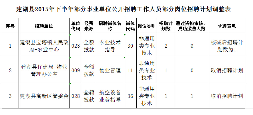 建湖縣2015年下半年部分事業(yè)單位公開招聘工作人員報(bào)名工作已結(jié)束。根據(jù)《建湖縣2015年下半年部分事業(yè)單位公開招聘工作人員公告》規(guī)定,現(xiàn)決定對部分未達(dá)開考比例的崗位招聘計(jì)劃作調(diào)整: